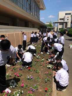 ですから、本当に掃除をしているところを見てもらえたらと、写真を撮ってきました。今回は体育館前の花壇の除草作業です。写真に写っている花と花の間に土が見えていますが、作業を行う前は、土が見えないぐらい雑草がびっしり生えている状態でした。一本一本丁寧に抜いてくれる子もいれば、とにかくブチブチたくさん抜いてくれる子もいます。さらに言うと、誰かが抜いた雑草を集めるだけの子もいました。ちりとりを持って花壇の周りを掃除してくれる子もいました。