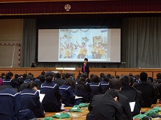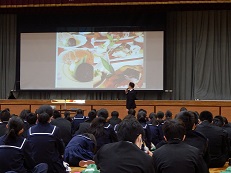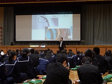 12月11日(金)の午後、キャリア教育の一環で、1年生対象の職業講話が行われました。地域で働く人に講師としてお越しいただき、それぞれの職業の説明、職業に就くために必要な資格、今の職業について辛かったことや嬉しかったこと、中学生にとって身につけておくとよいことなどを、仕事の様子の写真と共に話していただきました。