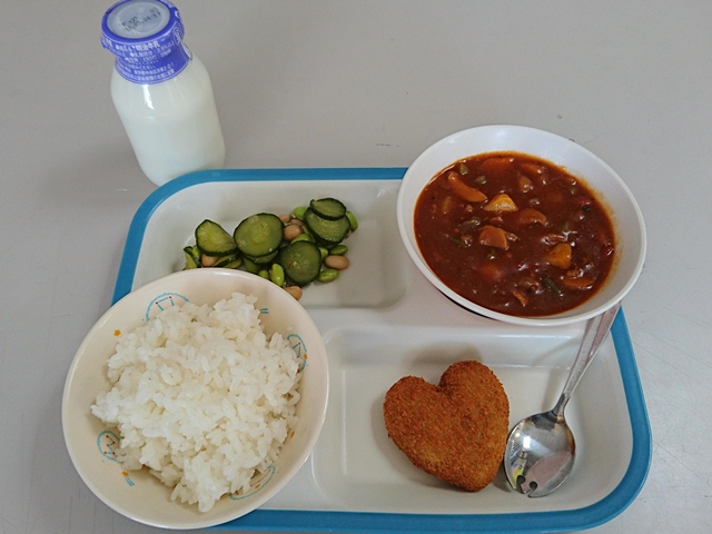 今日の給食は、ハヤシライス、牛乳、カボチャコロッケ、コロコロサラダでした。今日給食を食べた皆さんは気付いたでしょうか?あのカボチャコロッケには、カボチャだけでなく鶏肉が含まれていたことに。「どおりでおいしいわけだ。」これを読んだ人はそう思うはず。さらに、形がハート。給食センターからの愛情を感じます。また、ハヤシライスは安定のやさしい味。トマトの酸味を感じながら、今日もおいしくいただきました。ありがとうございました。