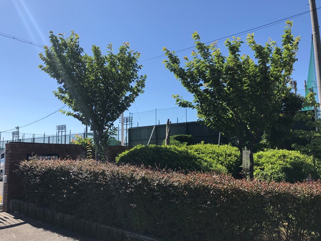 1枚目と2枚目の写真の違いに気付くことができますか?間違い探しです。1点あきらかに違う場所があります。気付きましたか?中央付近のやつです。葉の枝もない木がなくなっていることに気付いたでしょうか?今日、外掃除をしている最中に「あれっ?!何か変だ。中央の木はもっと上に長かったはず…」と思い、木に近づいたときです。その木のすぐ下に80cmぐらいの大木が転がっていました。昨日の雨風にやられたのでしょう。その後、その木に触れてみて、すぐに気付きました。この木はもっと前から死んでいたんだなぁ…と。別にその木に何の思い入れもありませんが、なぜか悲しい気持ちになりました。この木は、いつこの場所に植樹されたのだろう。周りのツツジより背が高くなり、周りを見渡せるようになったのは、いつなのだろうか。なぜそんなことを思ったのかというと、この木は、「おはよう」「さようなら」と帰って行く、甚目寺南中学校の歴代の生徒を見てきた木だろうと思ったからです。きっと在校生の保護者の方はこの木に見守られていたのかもしれません。いったいいつまで元気に葉をつけて生きていたのか?今日は、その木にお疲れ様でした。と先輩を見送る気持ちで、校門横の木を切りました。