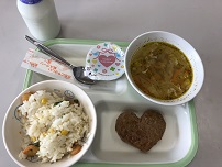 今日の給食は、洋風混ぜごはん、牛乳、ハートのハンバーグ、野菜コンソメスープ、バレンタインデザートでした。まさか、給食センターからバレンタインをいただくとは思いませんでした。どうやってホワイトデーにお返しをしたら良いのでしょうか。いつも感謝をしていただいているので、これ以上の感謝をもっていただくことができません。でも、バレンタインデーのプレゼントをもらったらお返しをしなければ…しばらく悩みたいと思います。今日も本当においしかったです。ありがとうございました。ごちそうさまでした。