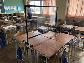 初日の三者懇談には間に合いませんでしたが、今日の懇談から、担任と保護者、生徒の間にアクリル板を設置することができました。相手の表情も見やすく、安全に懇談が行えたと思います。新型コロナウイルスの影響で、生活が変化していっていることがよく分かります。