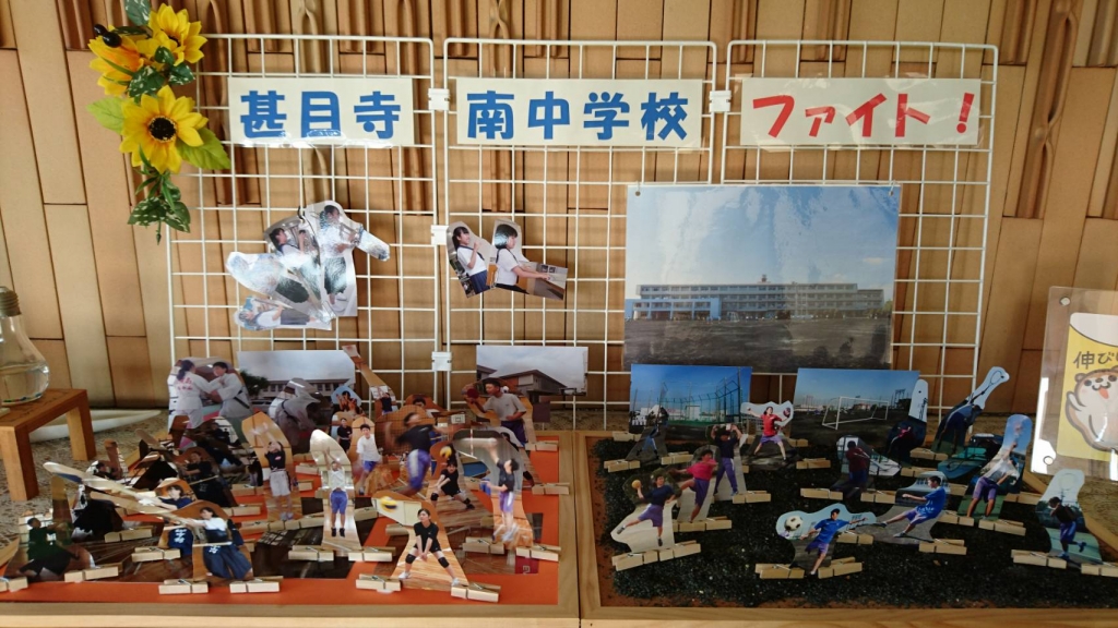 ※ 玄関のモニュメントに気付いてますか?みなさん。今年度も月替わりで玄関が彩られています。今年度の大会前に、みなさんの頑張りが見える温かい作りになっています。甚目寺南中学校のみんなでそれぞれの部活を応援しています。がんばってください!