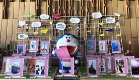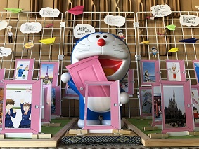 来賓玄関がまたデコレートされました。誰がやっているかは、もうご存知でしょうから、敢えて言いません。今回は人気作品のキャラクターからオマージュされています。どこでもドアから見える景色が様々な場所や人になっています。見ていて本当に面白いです。