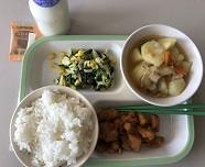 今日の給食は、ごはん、牛乳、鶏肉の揚げ照り、根菜ポトフ、キャベツの和風サラダ、コーヒー牛乳の素でした。キャベツの和風サラダは、ホウレンソウが素晴らしい働きをしていました。色、味、栄養素、こんな素晴らしい引き立て役はそうそういるものではありません。今日はもう一つです。鶏肉の揚げ照りです。鶏肉の周りを片栗粉と米粉でコーティングされていて、その衣が他に類を見ないほどの旨味を出してきていました。もうお手上げです。今日もおいし過ぎました。本当にありがとうございました。ごちそうさまでした。