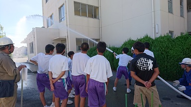 本校の2年生も参加し、可搬ポンプ放水や応急処置などの訓練に参加しました。