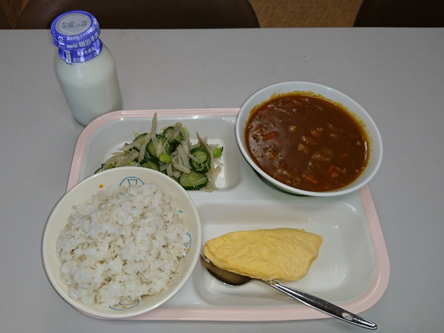 今日はチキンカレー(麦ごはん)、牛乳、オムレツ、枝豆サラダでした。今日のチキンカレーは、ほどよい辛さがある中に、かぼちゃの甘さが本当に合う一品となっていました。また、オムレツもカレーによく合い、ごはんを食べ過ぎてしまう給食でした。今日もおいしかったです。ありがとうございました。