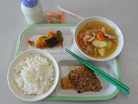 今日の給食は、ごはん、牛乳(コーヒー牛乳のもと)、鶏肉の香味焼き、かぼちゃの煮つけ、和風ポトフでした。鶏肉の香味焼きは、こころアップ道徳のこともあり、「お命いただきます」の気持ちを強くもたされました。もちろんおいしかったですし、ボリュームも満足でした。和風ポトフは玉ねぎのエキスがスープにとけ、ベーコンの旨味と合わさってとんでもない破壊力をもったスープに仕上がってました。さらに、そのスープを吸ったじゃがいもが、ゴロゴロと入っていてめまいがするほどおいしかったです。かぼちゃの煮つけは心を癒す効果を感じられました。今日の給食も本当においしかったです。ありがとうございました。ごちそうさまでした。