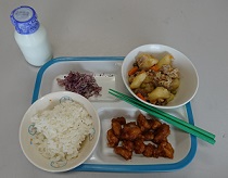 今日の給食は、ごはん、牛乳、鶏肉の揚げ照り、じゃがいものうま煮、しそ和えでした。うま煮は旨煮と表記されることもあり、「うま」の意味としては「旨み」を指すのが一般的とされているそうです。ということで、おいしいに決まっています。次に、鶏肉の揚げ照りです。鶏肉に衣をつけて揚げてあり、その衣が甘辛い味を存分に吸っています。今日もまた、ごはんの配分に困りました。今日も本当においしかったです。ありがとうございました。