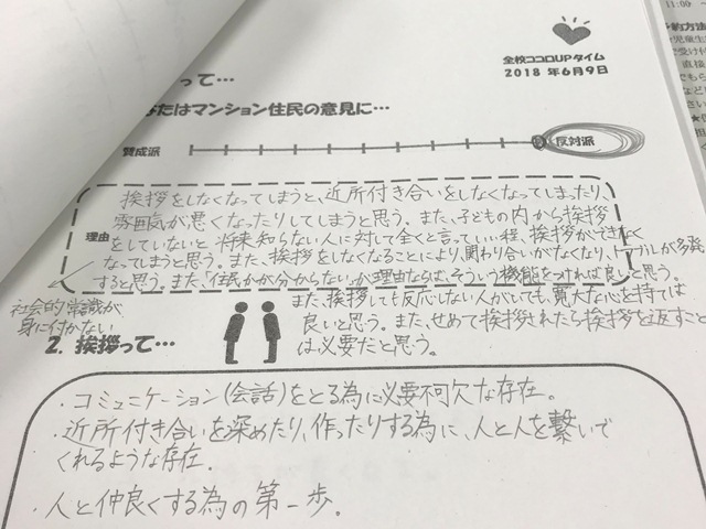 こころアップ道徳を行いました。今回は「あいさつ」です。ある記事を題材に考えていきました。マンション住人同士の『あいさつ禁止』です。「マンション内ではあいさつをしないように決めてください」――。神戸新聞の読者投稿欄『イイミミ』に寄せられた投書がインターネットで賛否両論の波紋を広げている。ということで、「理解に苦しんでいる」「理解できる」「知らない人にあいさつされたら逃げるように教えている」総会に出席した年配の住民も、あいさつしたが相手から返事がなく「気分が悪かった」ということで『お互いにやめましょう』と意見が一致したことから、“あいさつ禁止”のルールが明文化されることになった。という記事から全体であいさつを考えました。