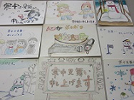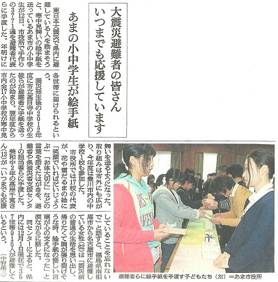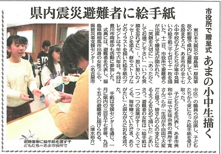 愛知県に避難されている方に寒中見舞いの絵手紙を送ろう!の会という甚目寺中学校が始めた、東日本大震災や福島第一原発事故後に愛知県に避難している方たちへの絵手紙を送る活動が新聞の記事に載っていました。今年は、この海部津島地区ではない、豊川市南部中学校も参加したということでした。もちろん本校も参加しています。