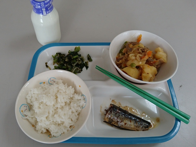 今日の給食は、ごはん、牛乳、いわしの梅煮、肉じゃが、磯香和えでした。今日はいわしについてお勉強です。いわしは縄文時代から、私たち日本人の栄養を支えてくれていることが分かっています。しかし、鮮度が落ちるのが早く、水揚げするとすぐに弱ってしまうことから、漢字では「鰯」と書くそうです。そんなデリケートないわし。脳の働きを活性化したり維持したりする作用があります。その結果、記憶力、集中力、学習能力などが向上すると考えられており、イワシを食べると頭が良くなるというのは、こういうわけだったんです。今日も残さず食べることができたでしょうか?ほかの料理も本当においしかったです。ありがとうございました。