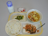 今日の給食は、鮭そぼろ丼、牛乳、和風ポトス、大根サラダ、さくらんぼでした。鮭そぼろはきっと想像通りの味だったと思います。それが安心の味です。また、和風ポトフは、ベーコンのうま味と、たまねぎの甘いうま味がスープに溶け込んでいて、とてもおいしかったです。今日もありがとうございました。