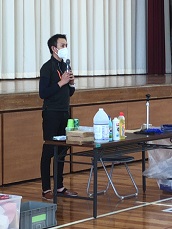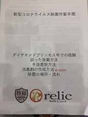 今日の講師には、株式会社レリックの代表取締役神野敏幸さんをお迎えしました。ダイヤモンドプリンセス号の除染作業を行った業者の方です。誤った除菌作業と正しい除菌作業の方法を教えていただきました。ゴム手袋の脱着方法から教室や使用する道具等の除菌の仕方を丁寧に分かりやすく説明していただき、すぐにでも実践していける知識をいただきました。