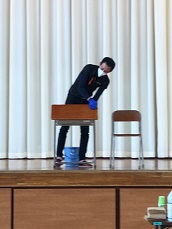 今日は生徒が帰宅した後、本校の職員とPTAの総務委員、そして、この地区の学校の養護教諭とあま市教育委員会の方たちで、除菌作業の講習を受けました。
