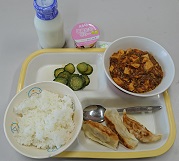 今日の給食は、ごはん、牛乳、マーボー豆腐、ぎょうざ、きゅうりの香り漬け、ピーチゼリーでした。ぎょうざが今日は本当においしかったです。味わい深く、噛めば噛むほど味が広がる感じでした。マーボー豆腐はたけのこがいいアクセントになっていました。今日の給食も本当においしかったです。ありがとうございました。ごちそうさまでした。
