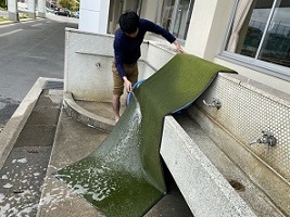 3人の中では先輩にあたるA先生が、私に玄関のマットをきれいにしたいのですがと、申し出てくれました。以前、他の学校に勤めているときにマットの掃除をしたことがあるらしく、「マットの掃除はいつまででも砂埃が出てくるんですよ」と言いながら、それでもやろうとして声を掛けてくれました。その先生からすると後輩にあたる2人の先生も、快くその作業に参加をしてくれました。チラッとその作業を見に行きましたが、マットをただはたくだけではなく、水で洗いながらデッキブラシでこすってと、とても手間をかけて掃除をしてくれていました。私はそこまでしてマットの掃除をしたことがありません。本当に頑張ってくれていました。