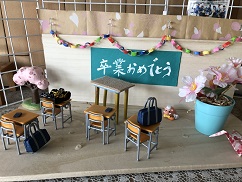 さて、月が替わるごとに玄関のモニュメントを紹介してきましたが、今回で今年度最後のモニュメントです。卒業式を控えた3年生に向けた愛情いっぱいのモニュメントです。今回も教頭先生の手作りです。巣立っていく教室の風景と、壁に掛けられた思い出たち。3年生が1年生の頃の写真が飾られています。教室の机には、生徒手帳や部活で使用する楽器が自然と置いてあり、本校のサブバッグにそっくりなカバンが机にあります。黒板の卒業おめでとうは、卒業式当日を思わせるような作りです。本来不自然な桜の木がとても自然に飾られていて、春の出会いと別れを感じます。