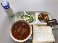 今日はなんだか久しぶりにスライスパンを見ました。ふわっとした触感のパンにチョコクリームをつけて食べます。なんだか口に入れただけで幸せでした。いかのフリッターはサクッとしたところが本当においしかったです。肉団子のトマト煮は、さっぱりしているのにもかかわらず、肉のうまみが出ていて美味でした。今日も本当においしい給食ありがとうございました。ごちそうさまでした。