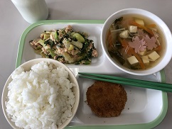 今日はごはん、牛乳、チキンカツ、春キャベツの和え物、春のすまし汁でした。春キャベツは、シャキシャキしていて色合いも良く、噛む回数を増やすと、甘みが増してきます。また、ツナとホウレンソウが合わさって、最高の和え物が出来上がっていました。そして、春のすまし汁ですが、こちらも素晴らしい色合いと、濃過ぎない味付けで最高でした。そんなさわやかな料理に、パンチのあるチキンカツ。パンで挟む料理で本当に良かったです。今日も本当においしかったです。ありがとうございました。ごちそうさまでした。