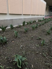 学校の花壇は最近の暖かな陽気のお陰で花をたくさん咲かせています。その奥からは心配し続けていたチューリップが無事葉をつけ、順調に成長してます。