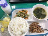今日の給食は、ごはん、牛乳、ビビンバ(肉炒め、ナムル)中華スープ、パイナップルでした。今日のビビンバは野菜のシャキシャキ感が最高でした。中華スープはえびの香りが食欲を増します。どれだけでも食べられそうで幸せでした。今日もありがとうございました。