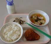 今日の給食は、ごはん、牛乳、ソースカツ、ひじきサラダ、冬のすまし汁でした。ソースカツですが、スキー場のランチで食べるソースカツの味がしました。そんなことを言われてもとお思いかもしれませんが、ソースカツから長野の雪山を思い出しました。音楽を聴いて、思い出す人や景色があるように、食べ物で思い出す人や景色もあります。今日は、冬のすまし汁を飲みながら、懐かしい思い出とともに給食をいただきました。今日の給食も本当においしかったです。ありがとうございました。ごちそうさまでした。
