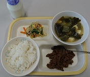 今日の給食は、ごはん、牛乳、ビビンバ(肉炒め)、ビビンバ(ナムル)、わかめスープでした。まず、牛肉が使われていることで感動しました。何度もこの場に書いて来ましたが、給食は280円の価値を超えています。ナムルは歯応えがきちんと残っていて、食べ応えがありました。わかめスープは玉ねぎの甘みと、トウモロコシの甘みがスープとよく合いました。また、鶏肉も入っていて味に深みが出ていました。給食の進化は止まらないです。今日も本当においしかったです。ありがとうございました。ごちそうさまでした。