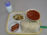 今日の給食は、ソフト麺、牛乳、ミートソース、ボイルウインナー、キャベツのサラダでした。ミートソースには、たくさんの具材が入っていました。豚肉、大豆、にんじん、トマト、玉ねぎ、グリンピース、マッシュルーム。スーパーで買うと結構値段の高いイメージのある、マッシュルームが入っています。意識して食べると、さらにおいしさがまします。今日も本当においしかったです。ありがとうございました。
