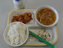 今日の給食は、ごはん、牛乳、揚げ鶏のねぎソース、ポテトサラダ、具だくさん汁でした。揚げ鶏のねぎソースは、濃いめの甘辛の味付けで、ごはんにぴったりでした。具だくさん汁は、はくさい、ごぼう、だいこん、えのきだけ、にんじん、とうふ、油揚げと本当にたくさんの食材が使われており、食べ応えがありました。味付けはあまり濃いめではなく、揚げ鶏とのバランスが考えられていて最高でした。ポテトサラダも最高です。高カロリーにならないように、ノンエッグマヨネーズです。本当にいろいろな配慮がされています。今日もおいしかったです。本当にありがとうございました。ごちそうさまでした。