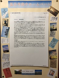 甚目寺南中のHPを掲示していくことにしました。いつも読んでくださる方には関係のない話ですが、「貼ってくださいよ。」と声をかけてくれた生徒がいたので、さっそく職員室の前にドンッと貼ってみました。今までの分すべては張り切れないので、それはインターネットで頑張ってみてください。一日一日心を込めて、学校の様子を伝えると同時に、何かをみなさんに訴えながら一緒に考えていける内容を書いていきます。よろしくお願いします。校内のみんなに読んでもらえるのだろうか…