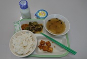 やっと給食が食べられる。待て…待て…犬の気持ちが少しわかるような数日間でした。今日の給食は、ごはん、牛乳、白身魚の甘酢、昆布和え、お月見汁、十五夜ゼリーでした。