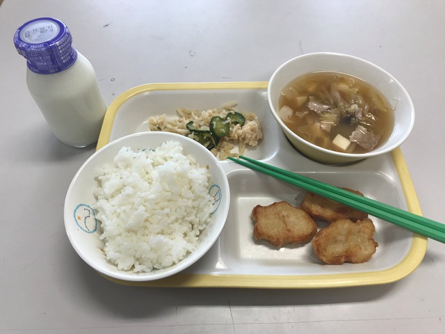 今日の給食は、ごはん、牛乳、おからナゲット、切り干し大根サラダ、具だくさん汁でした。今日はおからナゲットについて。今日のメニューの「おから」は絞りかすの意味です。大豆から豆乳を採取したあとの絞りかすです。茶殻の「がら」などと同じ「から」に丁寧語の「御」をつけたもののようです。そのおからをツナと合わせてナゲットにする発想が今日の驚きでした。そして、そのおからには脳の記憶力を高めるホスファチジルコリン(レシチンとも)が豊富に含まれているそうで、生徒の皆さんは午後の記憶力が良くなっていたかもしれません。今日もおいしくいただきました。楽しい食事をありがとうございました。