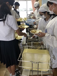 いつもと勝手の違う配膳方法でしたが、生徒は臨機応変に対応して、スムーズに給食を食べることができていました。今日のメニューはカレーライス、福神漬け、ソーセージでした。相変わらずおいしかったです。