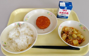 今日から通常の給食が始まります。皆さん、今日の献立は知っていますか。今日は、ごはん、牛乳、キャベツ入りミンチカツ、ジャガイモのうまにです。どれもとてもおいしそうです。みなさんも時々聞いた話かもしれませんが、給食が本格的に始まる今日、少しだけお話をさせてください。今日の給食の材料であるお米もキャベツも、牛肉・豚肉、玉ねぎ、こんにゃく、さやいんげん、牛乳など、どれも自分で作り出したものではありません。お米のひと粒でも、農家の方が小さな苗を田んぼに植え、肥料をまき、夏の暑いときには雑草を取り、時には台風に稲を倒され、それでも生き残った稲を秋に収穫し、脱穀し、袋に詰め、配送業者の方がトラックでお店まで届けてくださり、それを買って、炊いてご飯となります。一粒のご飯ができるまでに、実に多くの人の手がかかっています。牛肉や豚肉、牛乳などは、牛や豚の命をいただいています。ほかの材料についても同じように、命をいただいています。そして給食においては、その材料を調理員の方が調理してくださり、それを届けてくださる人がいて、学校についてから教室まで届けてくださる人がいます。