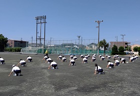 実際体育では、お互いの距離を保ちながら、それぞれに技術練習をしています。どうしても3密を避けられない場面もありますが、できる限りの対策をしながら生活をしています。