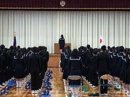 校長式辞で話されたのは、「4月に話したことを覚えているでしょうか。まず、人を大切にしよう。ということです。そして、一昨年度は交通事故で入院する生徒がいました。ですから、交通事故に気をつけよう。この2点をみなさんにお願いしました。1年間を振り返ってみてどうか。いろんな先生に聞きました。ほとんどの人が、人を大切にし、安全に登下校していたと聞いています。これからも気をつけてほしいと思います。