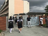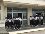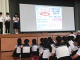 この日は盛りだくさんです。朝礼後に、保健委員会から熱中症対策の発表がありました。生徒から募集した熱中症に関連させた川柳を紹介しながら、自分の身体を冷やす方法や水分の取り方を勉強しました。また、脱水症状はどんな状態になるかを事前に知ることで、そうなる前に積極的に休憩をとり、水分をこまめに補給することが伝えられました。