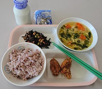 今日の給食は、五穀ごはん、牛乳、鶏肉の竜田揚げ、ひじきの炒め物、かきたま汁、乾燥小魚でした。まず、五穀ごはんです。五穀の時点で健康になった気分になります。もちろん食べただけですぐ健康になるなんて思っていませんが。五穀ごはんを用意してくれることに感謝です。そして、鶏肉の竜田揚げがおいし過ぎます。ニンニクと生姜が威力を発揮しています。そんなパンチの効いた竜田揚げのあとに、やさしいひじきの炒め物です。ほっこりします。今日はこれだけでは終わりません。かきたま汁があります。具だくさんで最高です。白菜と三つ葉がいいアクセントになっています。今日の給食も本当においしかったです。ありがとうございました。ごちそうさまでした。