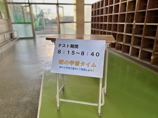 テストに向けて、家庭での学習や授業だけでなく、「朝の学習タイム」を活用してテスト対策を進めています。本来の8:25からの時間だけでなく、早く登校して自主学習に取り組む生徒が多くいます。8:15からは学習している人のために、学年全体で静かな雰囲気を作っています。