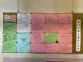 2年生のトイレ横にある掲示スペースに、図書委員の皆さんが作ってくれた「先生たちのおすすめ本」コーナーがあります。