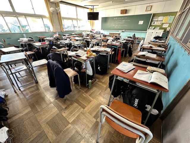 誰もいない教室......ではありません。今朝、全校生徒で行った「シェイクアウト訓練」の様子です。