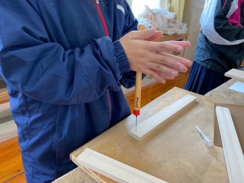 仮組み立て、くぎを打つ位置のけがきを終え、四つ目ぎりで下穴をあけます。