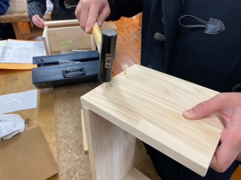 げんのうをよく見ると、平らな面と曲面がありますね。最初は平らな面で、最後は材面に傷が付かないように曲面で打っていきます。