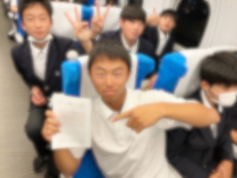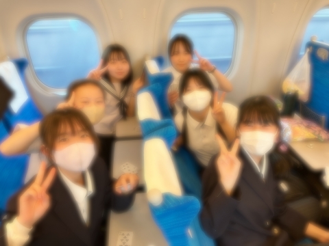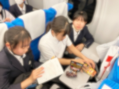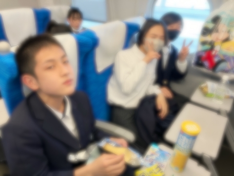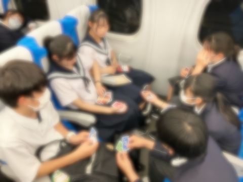 新幹線の中で、友達と会話したり、カードゲームで遊んだりしています。