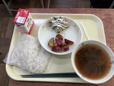 本日の給食では大学芋が登場しました。大学芋があるなら中学芋、小学芋もあればいいのに…と思ってしまいます。食べる前に大学いもの名前の由来を教えてくれた生徒もいました。美味しくいただきました。