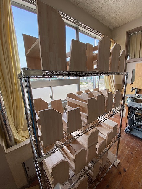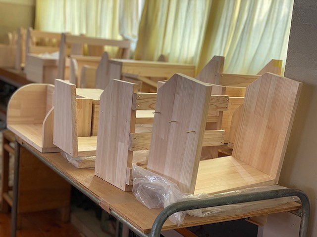 木工室には、新2年生が昨年度に製作していた木工製品が並んでいます。残念ながら未完成で年度を越してしまいました。完成が待ち遠しいです。