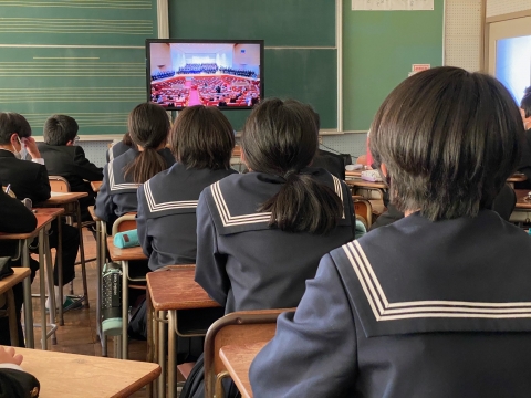 例年、美和中学校で行われてきた美中祭の文化祭では、全校生徒の前でクラス合唱や学年合唱を披露します。しかし、今年は学年ごとの開催となったため、他学年の合唱を聴くことができませんでした。そのため、音楽室でモニターを使って2、3年生の合唱の映像を見ました。