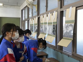 昨年度、コロナによる休校のため制作が途中になっていた水墨画の作品を完成させ、授業内で展覧会を開きました。