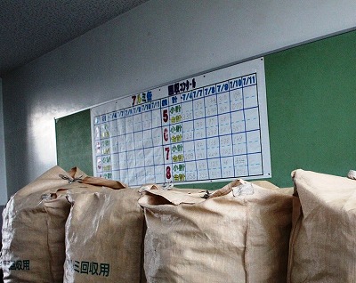 1年生がアルミ缶回収をしました。総合計一万二千缶以上集まりました。